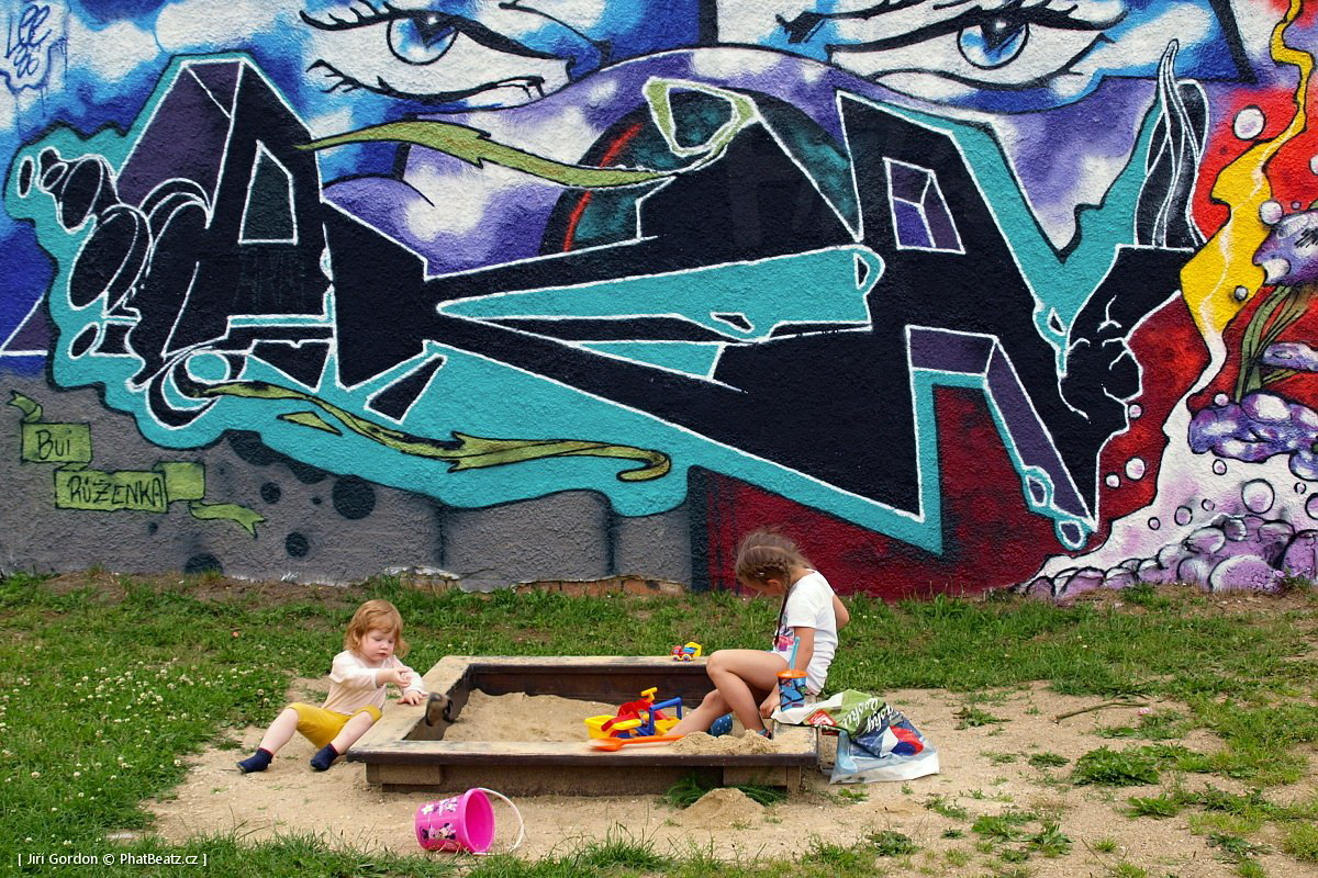Graffiti u dětského pískoviště v rámci Graffiti Boom 06 má na svědomí LEE, který stihnul ještě dvojici medúz na čele objektu garáží u stadionu. O levou část se postaral OBIC a pokud se někdo domníval, že dělá pouze ornamentální geometrické malby založené na lince má možnost změnit názor - „hráli jsme šipkovanou vždyť to znáš…“ Pravá část zobrazuje nelítostný boj o pyramidu, které vládne BLAM.